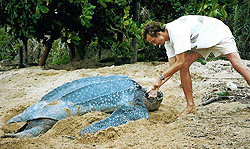 program: In 1999, the focus of the activities of Biotopic shifted to the leatherback population. A PIT-tagging program was initiated in order to obtain better information on the size, trends, and parameters of the leatherback population in Suriname and to assess the extent of nesting exchange with French Guiana. In addition, data on biometrics, nest survival, hatch success and sand temperatures were collected. The PIT/tagging program was continued for seven years. Three leatherback females that were PIT-tagged in Suriname during the project were subsequently encountered off the coast of Nova Scotia, Canada. The results of the PIT-tagging program were published in 2007 in Chelonian Conservation and Biology: "Nesting and Nest Success of the Leatherback Turtle (Dermochelys coriacea) in Suriname, 19992005. Chel. Cons. Biol. 6(1): 87100." (download PDF).